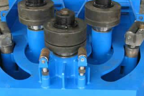 方管型材彎曲機的三個工作輥均為主驅動輥,通過液壓馬達、齒輪來實現,兩下輥升降為液壓傳動,兩下輥可圍繞固定回轉中心做弧線升降運動,工作輥的兩側設有托輥和矯正導向輥裝置,有利于保證非對稱截面(比如角鋼)型材卷制質量。 該機型為三輥全驅動,可進行型材端部的預彎,通過調節導輥,可對非對稱型卷制過程中產生的扭曲進行校正,所有動作均由電器控制柜上的按鈕來完成,位移數字顯示,顯示精度0.1mm。根據型材截面的形狀可完成不同形狀的卷制。該型設備的優點是卷制型材的精度好、工作效率高。
